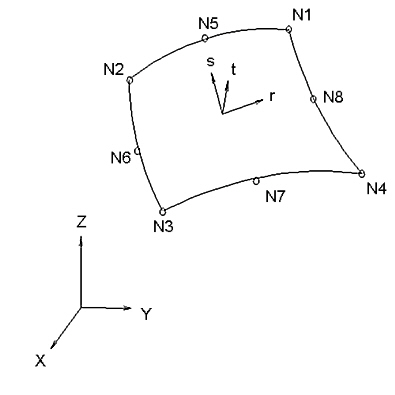 3D のシェル要素は、タイプ 26 要素であり、4 から 8 節点のアイソパラメトリック 4 辺形、または 3 から 6 節点の 3 角形要素です。厚肉および薄肉シェル両方の問題をモデル化する場合に適用できます。また、厚さの変数を含む二重に曲げられたシェルのジオメトリは、このシェル要素を使用して正確に記述することができます。この要素形成の理論的内容は、Bathe および Balourchi で見つけることができます。