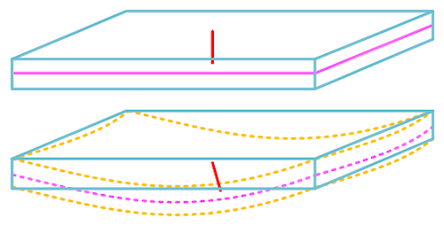 薄肉シェル理論では、要素法線はシェルの基準サーフェスに対して直交した状態が維持されます。これを Kirchhoff 拘束と呼びます。これをグラフィカルに示したのが次の図です。赤い線は要素法線を表し、マゼンタの線は中立面(基準サーフェス)のエッジです。