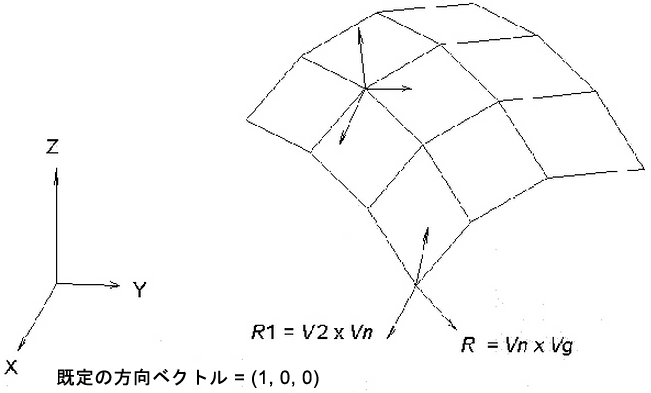 既定の方向ベクトル Vg は (1,0,0) です。すなわち、R1 軸は実際にはシェル サーフェス上への方向ベクトル Vg の投影です。R2 軸は、このシェル サーフェス上に存在しますが、R1 および法線ベクトル Vn に対して直交です。図 3 は、既定の方向ベクトル(1,0,0)を使用した R1 および R2 の方向を示しています。