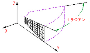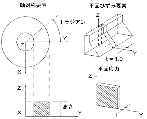 - [軸対称]: Z 軸を基軸とする対称的な幾何条件、荷重条件および境界条件を使用して固体をモデル化する要素に対して、この幾何モデル タイプを選択します。負の Y 座標は適格ではありません。節点が回転の軸(Z 軸)に沿ってある場合、Y 方向の移動を制約する必要があります。節点荷重は、円のラジアン数によって標準化されます(荷重をラジアンによって割る)。