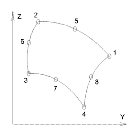 2D 要素は、全体 Y-Z 平面で入力する必要のある 3 節点 または 4 節点のアイソパラメトリック 3 角形または 4 辺形です。図 1 は、典型的な 2D 要素をいくつか示しています。図 2 が示すとおり、要素によって平面ソリッドまたは軸対称ソリッドを表現できます。どちらの場合でも、各要素節点には、2 並進自由度があります。軸対称ソリッドまたはシェルを表現するために要素を使用する場合、全体 Z 軸が回転軸になります。すべての要素は、+Y 半平面に存在している必要があります。この場合、Y は半径軸を表します。図 2 は、3 つの規則的内容を示しています。