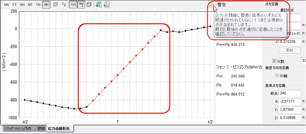 SCL が要素のないスペースの領域を貫通している場合、その SCL の部分に沿ったデータ点が最も近い有効なデータ点から補間されます。このような場合、カーブおよびデータ点はモデル要素の外側にあるグラフの部分が赤で表示されます。さらに、警告記号がグラフ領域の右上隅に表示されます。 カーソルを使用してこの通知をポイントすると、問題を説明するポップアップ メッセージが表示されます。次の画像は、曲線の部分が赤で示され、関連する警告メッセージが表示されているグラフの例を示します。
