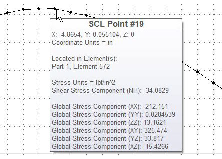 このボックスには、SCL 点の全体座標と、点の位置のパーツと要素の番号が表示されます。また、現在グラフ化されているローカル応力テンソルと、応力線形化の結果の派生元となる 6 つの全体応力テンソルも含まれます。