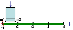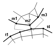 | (a) 元のジオメトリから判断すると、点サーフェス間接触タイプが受け入れ可能です(点は目標節点です。t1-t5 がマスター節点のサーフェス m1-m2 に接触します)。 |