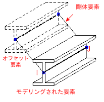 オフセットは、中立軸が実際に配置されている位置にビームを構成する線を描画できない場合にビーム要素に適用します。適切な距離と方向でビームをオフセットして、ビーム特性が適切な中立軸の位置に表示されるようにします。下の図では、ビーム オフセットが適用されたビーム要素がプロセッサによってどのように認識されるかを示しています。