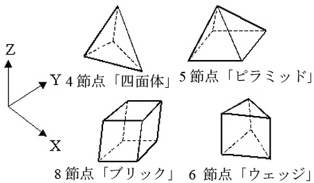 3D 熱伝導ブリック要素は、3D 空間で定式化された 4 節点、5 節点、6 節点、および 8 節点の要素です。所定の要素を構成する節点数の決定は、ラインの連結度に基づいて自動的に行われます。要素に配置する要素数を指定する必要はありません。3D ブリックで構成されるモデルは、4 節点、5 節点、6 節点、および 8 節点のブリックを混在して含むことができます。
