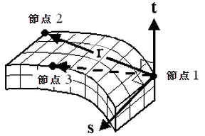 ブリック要素の材料軸は、r 軸、s 軸、t 軸です。 これらの軸は、3 つの節点を[節点 1 の方位][節点 2 の方位][節点 3 の方位]の各フィールドで指定して定義します。まず、[結果]環境でモデルを確認し、節点番号を判別する必要があります。