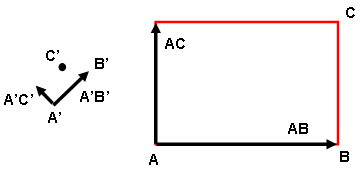本質的に、[再配置と尺度]では、選択したラインに対して、1 つの平面(3 点による定義)から別の平面(3 点による定義)への移動、回転、尺度(オプション)を実行します。すなわち、平面 A-B-C から平面 A'-B'-C' までの移動と等しい距離で、選択した項目を移動および回転させてます。 次の図を参照してください。