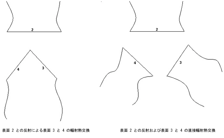 図 1。表面 2、3、4 (およびその周囲)によって 1 つのエンクロージャが形成されます。エンクロージャは、相互に輻射するサーフェスの集合ですが、これらのサーフェスは他のサーフェスとは輻射しません。