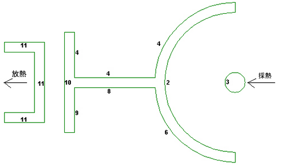 図 3。 相互の間で輻射するサーフェスの独立した 4 つのセットが存在します。したがって、4 つのエンクロージャが定義されています。エンクロージャ 1: 表面 2 と 3。エンクロージャ 2: 表面 4。エンクロージャ 3: 表面 6、8、および 9。エンクロージャ 4: 表面 10 と 11。