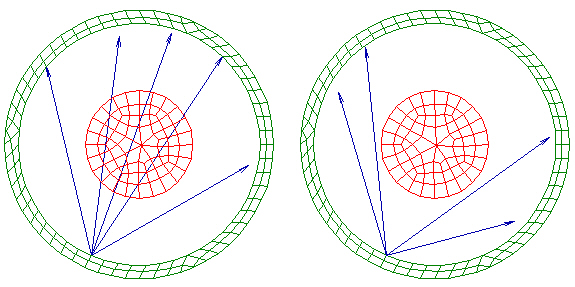 図 4。 シャドーイングを含めない場合(a)、パイプの内側の点が、パイプの内側にある他のすべての点を見通すことができます。シャドーイングを含める場合(b)、視野の一部が内側のシリンダによって遮られます。
