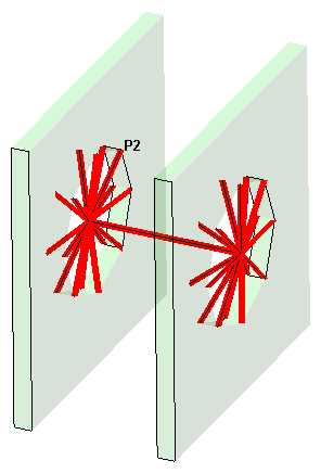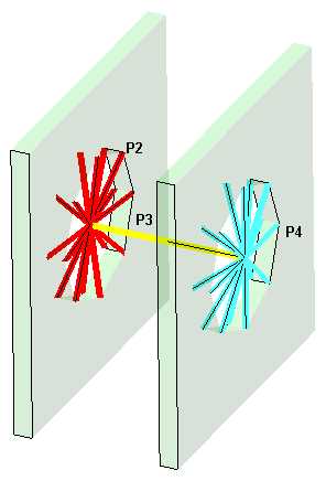 | 不適正な例。剛体要素により、大きなアセンブリの 2 つのブラケットが接続されています。この例の剛体要素(パーツ 2、図内では P2 と表示)には不適正な部分があります。このパーツ内の各要素は、同一の節点を共有していません。適正なジオメトリを生成するためには、1 つのパーツ内にある各剛体要素は 1 つの節点に接続されている必要があります。(剛体要素をより明瞭に表示するため、ブラケットは透明化して表示してあります。) | 適正な例。各パーツに含まれる剛体要素は、それぞれ 1 つの節点を共有しています。パーツ 2(P2)では、中心にある節点にすべての剛体要素が接続されています。パーツ 4(P4)も同様です。パーツ 3(P3)は両側のパーツを接続しています。パーツ 3 は、1 つの要素でも 2 つの要素(中心の節点を共有する)でもかまいませんが、3 つの要素に分割することはできません。3 つの要素では、1 つの節点を共有しないためです。 |