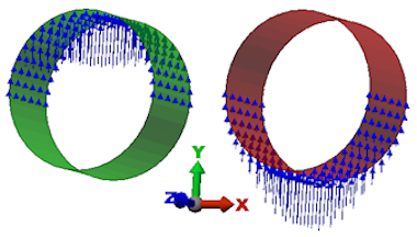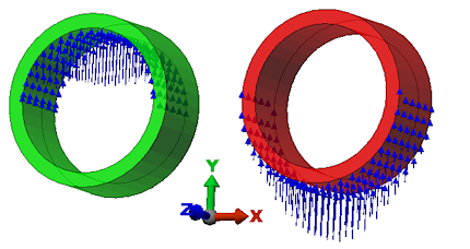 ベクトルの方向はどちらのパーツでも同じです(+Y)。左側の荷重は[内面]オプションを選択した場合に発生します。右側の荷重は[外面]オプションを選択した場合に発生します。