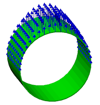 - スラスト荷重は、次に示すように、選択した円筒サーフェスのすべての節点に沿って分布されます。
