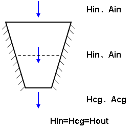 | (a) 仮想モデル上では、流入面、図心(cg)、流出面のすべての領域を通る熱流量(H)が等しくなります。 | (b) FEA では、図心で計算された熱流束(hfcg)は、面を通る熱流量(H)の計算に使用されます。Ain および Aout が Acg と等しくない場合は、流入する熱と流出する熱は等しくなりません。 |