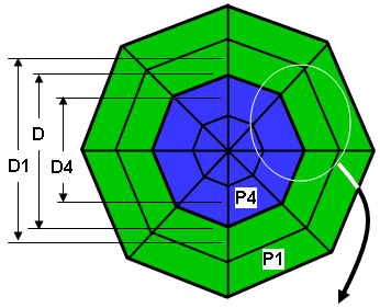 (a) 2 つのパーツから成るモデル: 外側がパーツ 1(緑)、内側がパーツ 4(青)です。パーツ 1 の内部要素の図心の直径は D1 です。パーツ 4 の外部要素の図心の直径は D4 です。 |