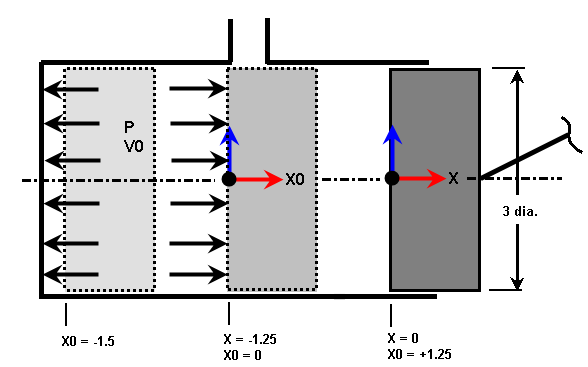 3 つの位置におけるピストンを示しています。モデルが引かれた位置が X = 0、排気口が閉じた時点が X0 = 0 です。したがって閉じ込められるガスは量が V0、圧力が P となり、ピストンが前に進んだ位置は X0 = -1.5 となります。
