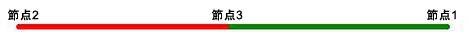 スライダ要素には、2 本のラインとそれらを接続する 1 つの節点が作業を適切に行うに上で必要になります。2 本のラインの角度は 180 度である必要があります(つまり、結合したときに 1 本の直線になる必要がありあます)。この 2 本のラインを接続する節点は、節点 3 として扱われます。節点 1 と 節点 2 は特に指定がない場合、プログラムによって決定されます。節点 1 と 節点 2 は 2 本のラインのサーフェス番号を使用して指定できます。節点 1 はサーフェス番号が小さい方のラインの節点になり、2 本のラインを接続する節点ではありません(下の図を参照してください。緑は表面 1、赤は表面 2 を表しています)。