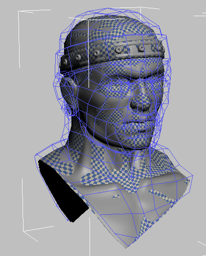 병사 머리의 편집 가능한 메시 모델 오브젝트만 표시됩니다. 이 오브젝트는 법선 범프 맵이 적용될 저해상도 대상 오브젝트로, 대략 750개의 다각형으로 구성되어 있습니다. 표면은 매끄러우며 체크 무늬 텍스처 맵이 적용되어 있습니다. 이 체크 무늬 맵은 표면의 텍스처 매핑을 설정할 때 시각적 가이드로 사용되었습니다. UVW 둘러싸기 해제 수정자도 이미 적용되어 있습니다.