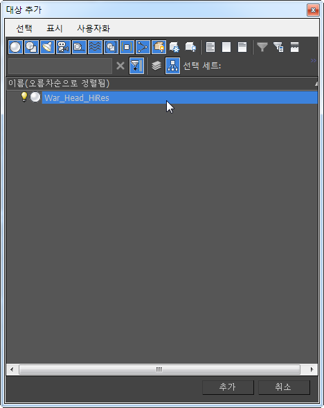 병합을 선택한 다음 파일 대화상자에서 장면 파일이 포함된 폴더를 탐색합니다. 고해상도 모델 warrior_headhires.max가 포함된 장면을 선택한 다음 열기를 클릭합니다. 3ds Max에 병합 대화상자가 열립니다.