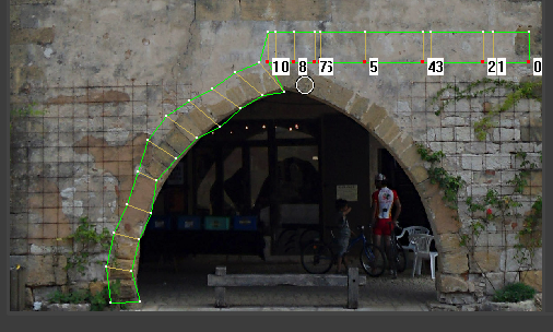 원통 기즈모에는 초록색으로 표시되는 높이 세그먼트가 한 개 있습니다. 이 세그먼트는 원통형 매핑의 이음새가 배치될 위치를 나타냅니다. 현재 초록색 세그먼트는 아치의 오른쪽 부근에 있습니다.
