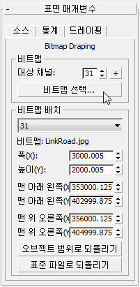 이 드레이핑 탭에는 표면에 비트맵을 적용할 수 있는 컨트롤이 있습니다.