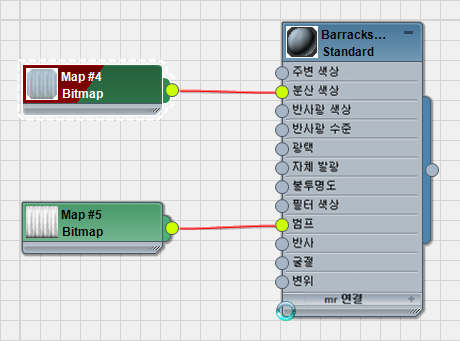 - 막사 벽 재질의 범프 구성요소에 노드를 와이어링합니다.