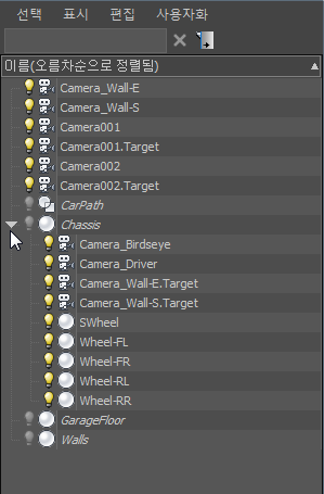 4개의 바퀴와 스티어링 휠이 어떻게 섀시 오브젝트의 하위가 되는지 확인합니다. 이 계층은 3D 자동차 모델에서 일반적으로 사용됩니다.