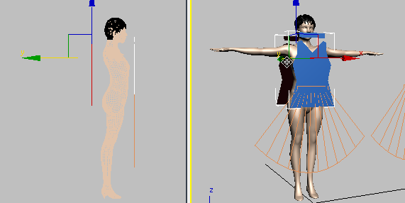 의상 수정자가 시간에 따라 애니메이션되는 시뮬레이션을 실행합니다. 의상이 몸체에 정확하게 맞으면 로컬 시뮬레이션(제동)을 다시 클릭하여 끕니다.