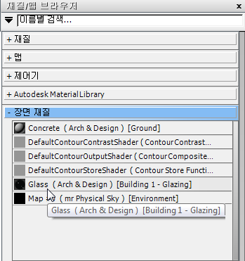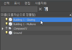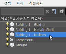 - 장면 탐색기 패널에서 건물 1 - 글레이징 오브젝트를 클릭하여 선택합니다.