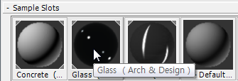 - 재질 편집기 브라우저(왼쪽)의 샘플 슬롯 섹션에서 유리 재질을 찾은 다음 뷰1 창으로 드래그합니다.