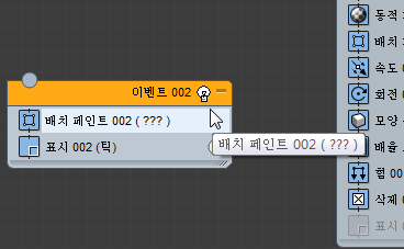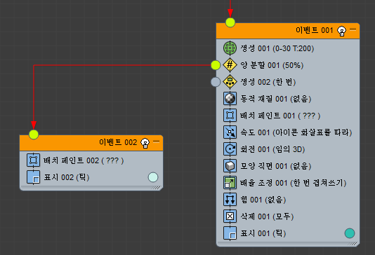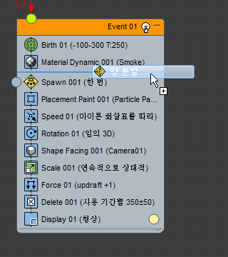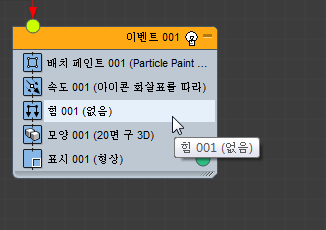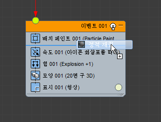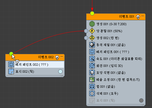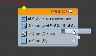 이벤트(연산자, 테스트 등)를 이벤트 표시의 빈 부분에 드롭하면 파티클 흐름에서 새 이벤트를 만듭니다. 초기에 새 이벤트에는 드롭한 연산자와 표시 연산자가 포함됩니다.