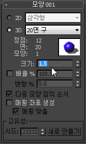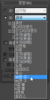 - 모양 롤아웃에서 3D를 선택한 상태로 두고 3D 드롭다운 리스트에서 20면 구를 선택합니다.