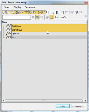 - 힘 공간 왜곡 선택 대화상자에서 클릭한 다음 Ctrl 키를 누른 상태로 폭발 공간 왜곡, Gravity001을 클릭해 선택하고 선택을 클릭합니다.