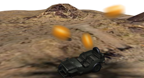 을 클릭하여 애니메이션을 재생합니다. 불씨가 지프차에서 멀리 날아갔다가 지면으로 다시 떨어집니다. 이러한 움직임은 투시 뷰포트에서 가장 쉽게 확인할 수 있습니다. 불씨는 다소 크게 보이지만 연기 파티클과 마찬가지로 재질을 적용하면 모양을 수정할 수 있습니다. 이 재질을 만드는 것이 다음 절차의 주제입니다.