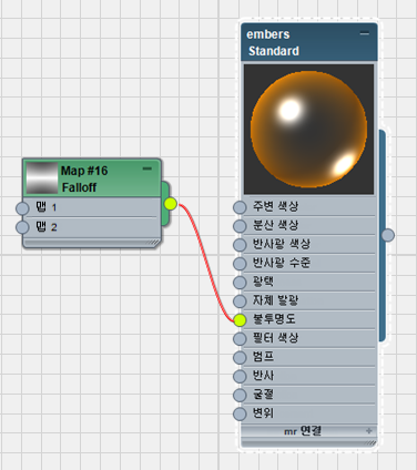 - 브라우저의 폴오프 맵을 불씨 뷰로 드래그한 다음 불씨 재질의 불투명도 구성요소로 와이어링합니다.