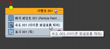 이벤트 002에서는 파티클 페인트 002를 불씨 파티클 생성용 소스로 사용합니다.