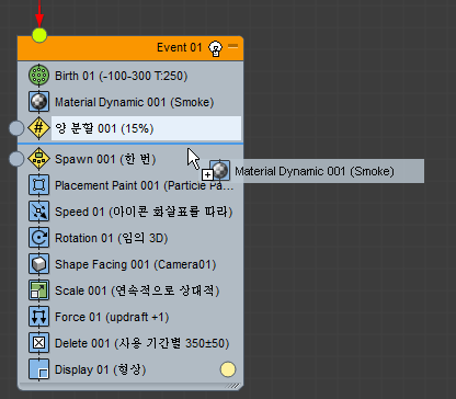 동적 재질 연산자를 이동하면 불씨 파티클에 연기 파티클과 다른 재질을 할당할 수 있습니다.