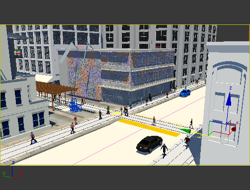 디스플레이 패널에는 빠른 미리보기를 위한 막대 그림에서 텍스처된 스킨에 이르기까지 다양한 표시 옵션이 포함되어 있습니다. 클로즈업 렌더링을 위해 캐릭터를 고해상도 스킨으로 전환할 수도 있습니다. 이 자습서에서는 긴 뷰(예: Camera001 뷰)에 적합한 기본 저해상도 텍스처된 스킨을 사용합니다. 보행자가 많은 곳의 밀도 높이기: