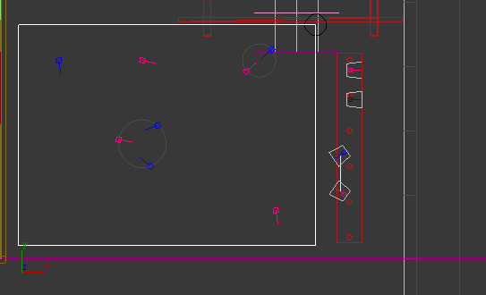 앉아 있는 사람이 마주 보고 있는 경우(예에는 아래쪽 두 좌석이 배치되어 있음) 기본적으로 캐릭터는 서로 상호 작용합니다. 와이어프레임 뷰포트에서는 상호 작용하는 좌석 사이에 선을 표시하여 이를 나타냅니다.