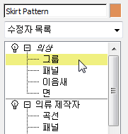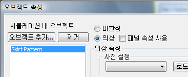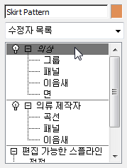 시뮬레이션 내 오브젝트 리스트에서 치마 패턴을 클릭하여 강조 표시한 다음 의상을 선택합니다.