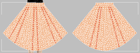 - 주름 세그먼트의 나머지 항목에 대해 위의 네 단계를 반복합니다. 이때 주름 강도로는 항상 5.0을 할당하고 주름 각도로는 150.0과 반대 값인 -150.0을 번갈아 가며 할당합니다. 치마 후면 패널로 계속 이동하면서 이와 같이 값을 번갈아 가며 적용합니다.