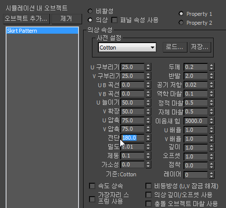 - 의상 특성 그룹에서 U 늘이기 값을 50.0으로 변경합니다. 그러면 V 늘이기 값도 변경됩니다. 전단 값을 180.0으로 변경합니다. 다른 의상 설정은 변경하지 않고 그대로 둡니다.