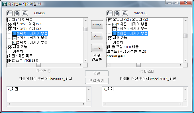 - 매개변수 와이어링 대화상자에서 방향 컨트롤 위의 오른쪽 화살표를 클릭하여 Chassis Y 위치가 Wheel-FL Z 회전을 제어하도록 합니다.