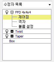 더하기 기호 아이콘을 클릭하여 FFD(상자) 수정자 계층을 확장합니다. 제어점을 클릭하여 선택합니다. 그러면 이전 단계에서 정의한 격자 제어점을 선택하여 조작할 수 있습니다.