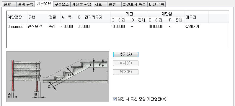 회전 시 곡선 중심 계단옆판 선택 취소 |