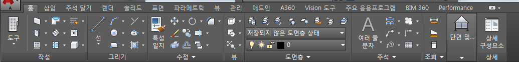 홈 탭에는 소프트웨어 내에서 가장 자주 사용되는 명령이 들어 있습니다. 여기에서 기본 객체 및 도면 도구뿐만 아니라 수정 도구, 도면층 및 기본 주석과 같이 자주 사용되는 유틸리티를 찾을 수 있습니다. 새 도면에서는 시작점으로 홈 탭을 사용합니다.