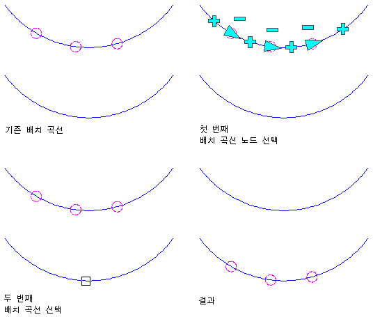 다음 절차에 따라 배치 곡선을 한 객체에서 다른 객체로 이동시키십시오. 배치 모드는 이 작업에서 그대로 유지됩니다. 배치 곡선이 처음에 균등한 간격 노드와 함께 삽입된 경우 노드는 새 객체에서 균등한 간격으로 유지됩니다.