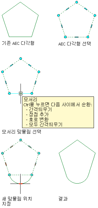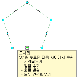 | 선택된 모서리를 호로 변경 | CTRL 키를 두 번 눌러 호로 변환 편집 모드로 전환합니다. 중간점을 원하는 위치로 신축하고 클릭하거나, 값을 입력한 후 ENTER 키를 누릅니다. |