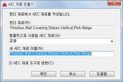 - 렌더 재료를 직접 도면으로 끈 경우에는 AEC 재료 작성 워크시트가 표시됩니다.